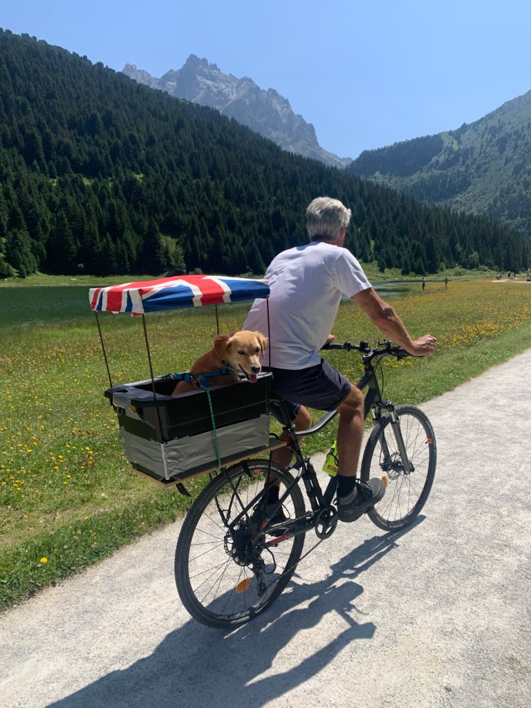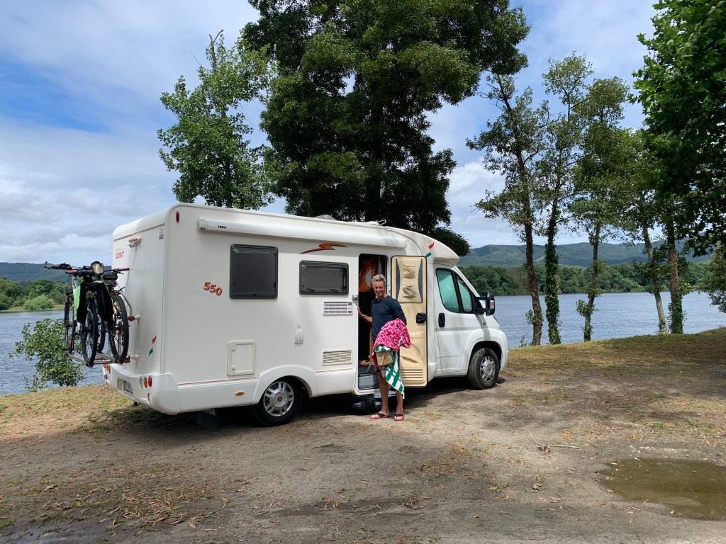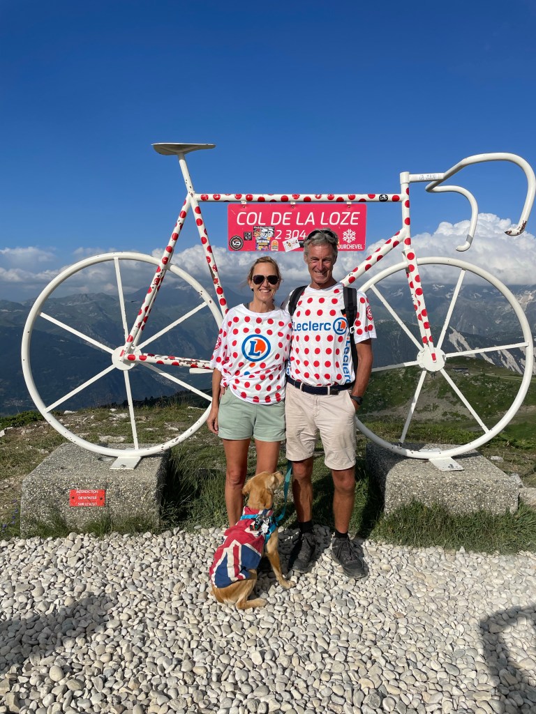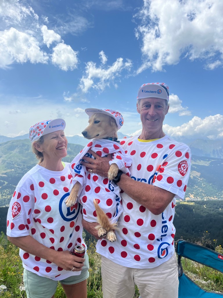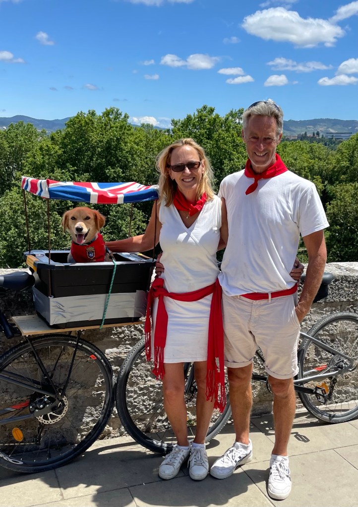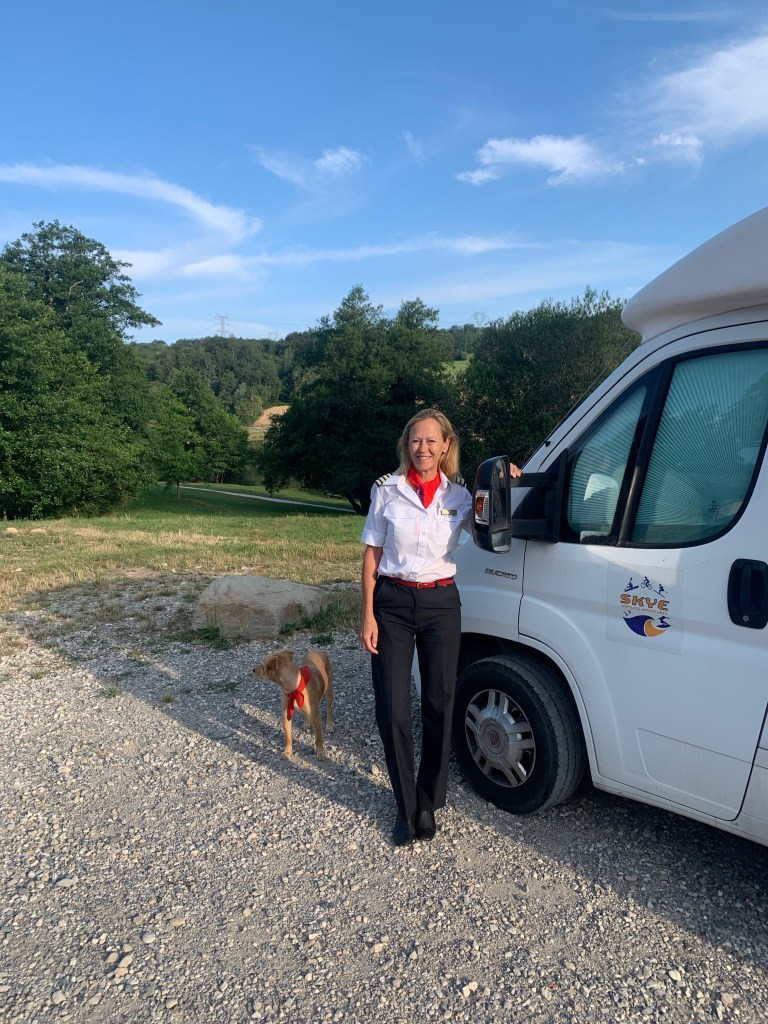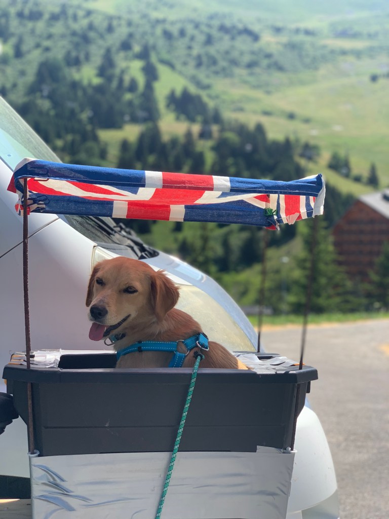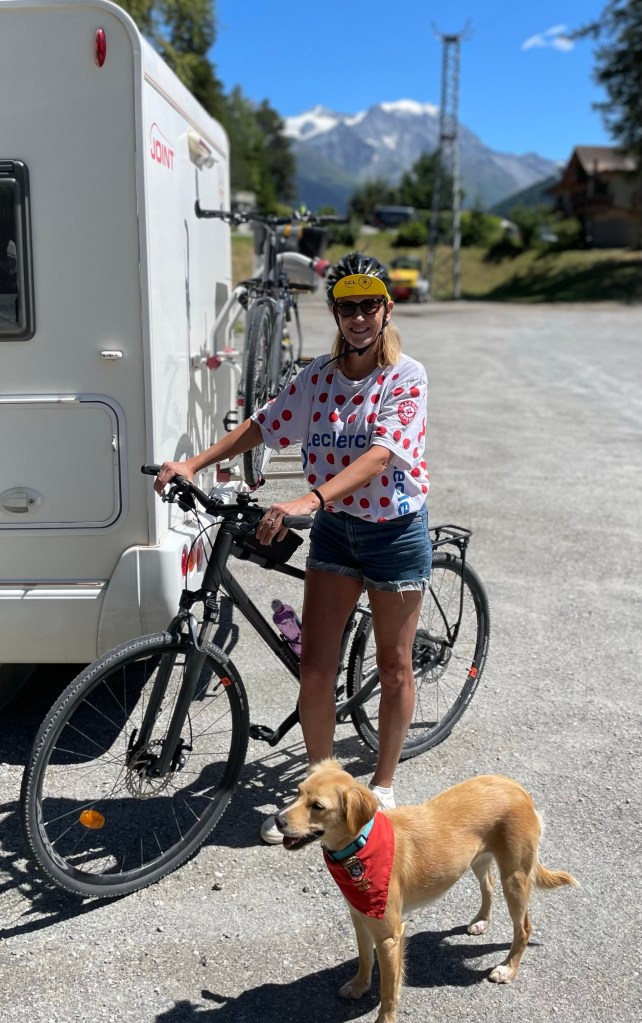 But there were two other highlights at Arromanches which were especially memorable. At low tide there were always lots of military vehicles of all shapes and sizes driving around the beach which was fun to watch from the sea wall. The MVT put on a great display one afternoon with all 350 of their vehicles together with lots of their enthusiasts dressed up in military uniform and 1940s fashion and music and we enjoyed being in amongst everyone and soaking up the wonderful atmosphere. As Skye was parked up and we were on our bikes, we took the opportunity to cycle up and down the beach with Sandie in her ‘tub’ on the back of my bike with her Union Jack shade – being the consummate professional that she is, she got lots of attention which she naturally took in her stride and even ended up on French TV – TF2!