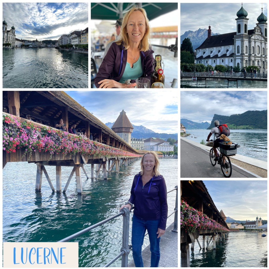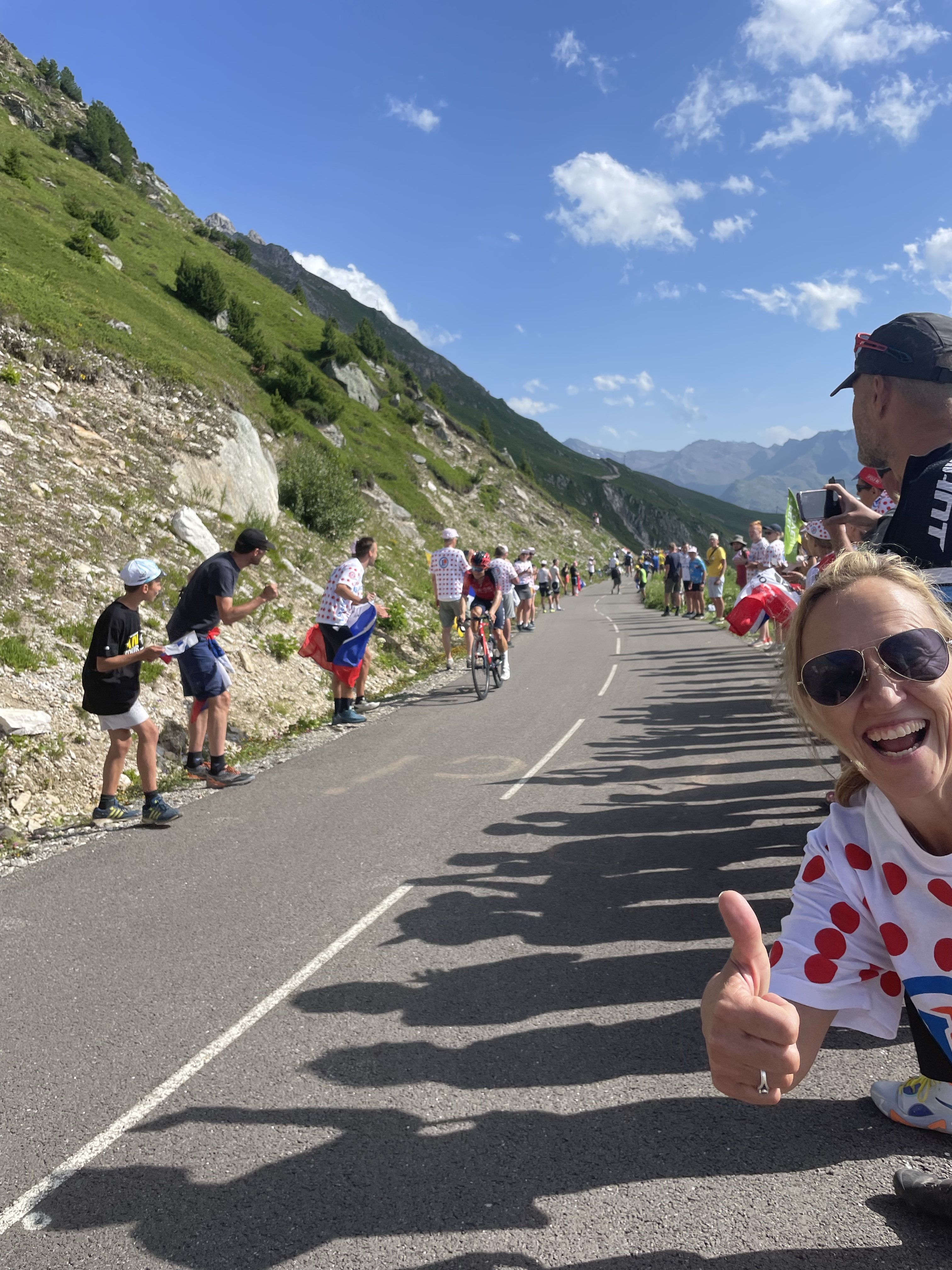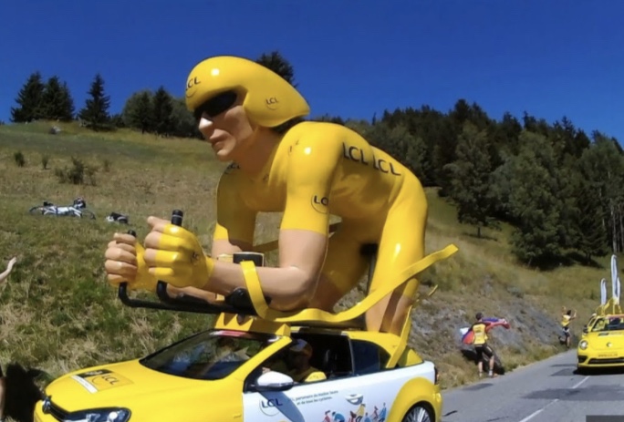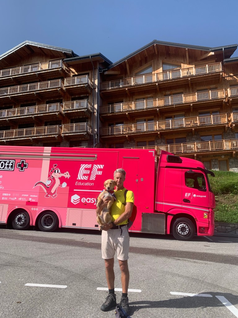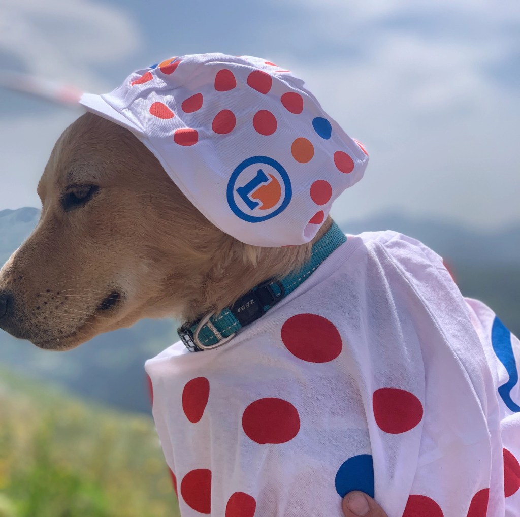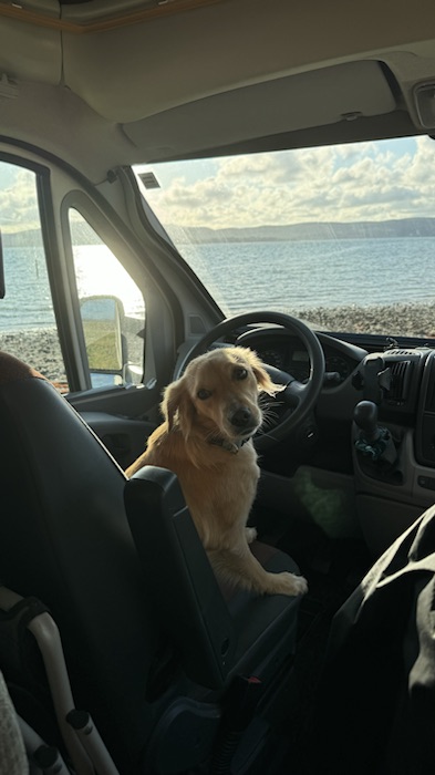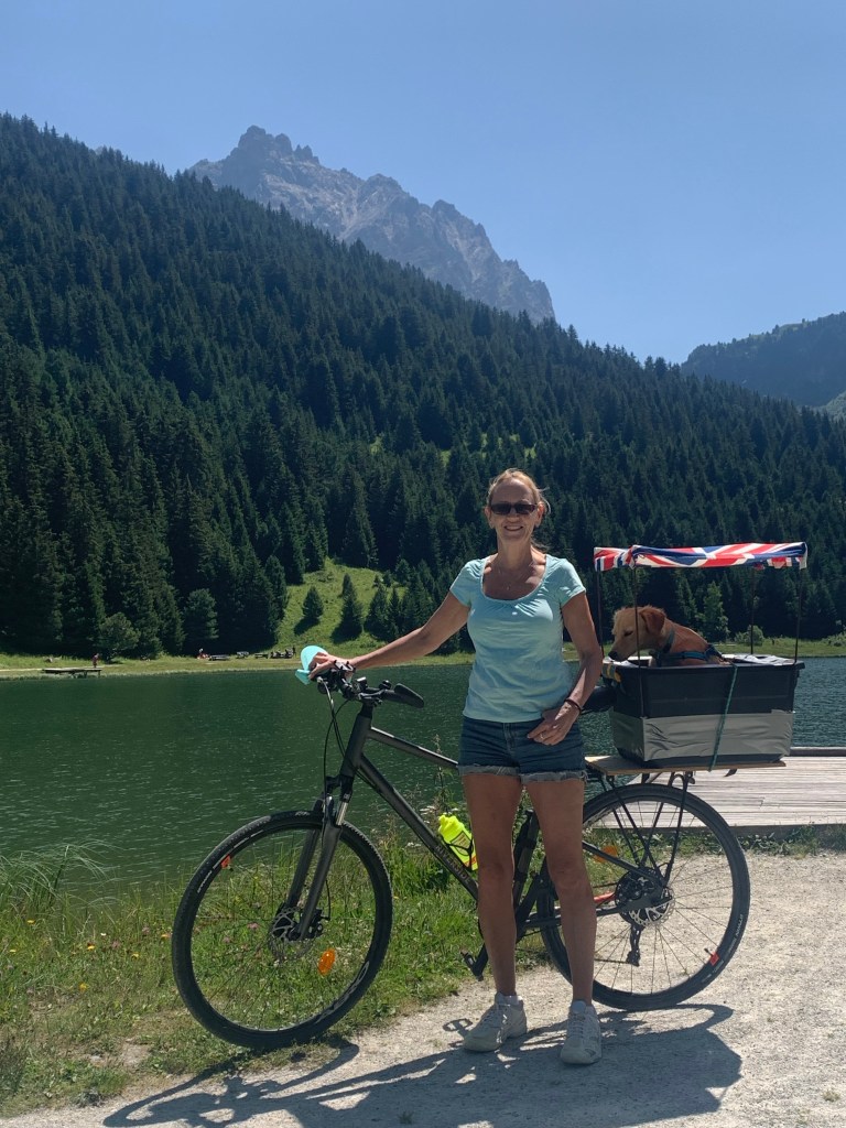 But there were two other highlights at Arromanches which were especially memorable. At low tide there were always lots of military vehicles of all shapes and sizes driving around the beach which was fun to watch from the sea wall. The MVT put on a great display one afternoon with all 350 of their vehicles together with lots of their enthusiasts dressed up in military uniform and 1940s fashion and music and we enjoyed being in amongst everyone and soaking up the wonderful atmosphere. As Skye was parked up and we were on our bikes, we took the opportunity to cycle up and down the beach with Sandie in her ‘tub’ on the back of my bike with her Union Jack shade – being the consummate professional that she is, she got lots of attention which she naturally took in her stride and even ended up on French TV – TF2!