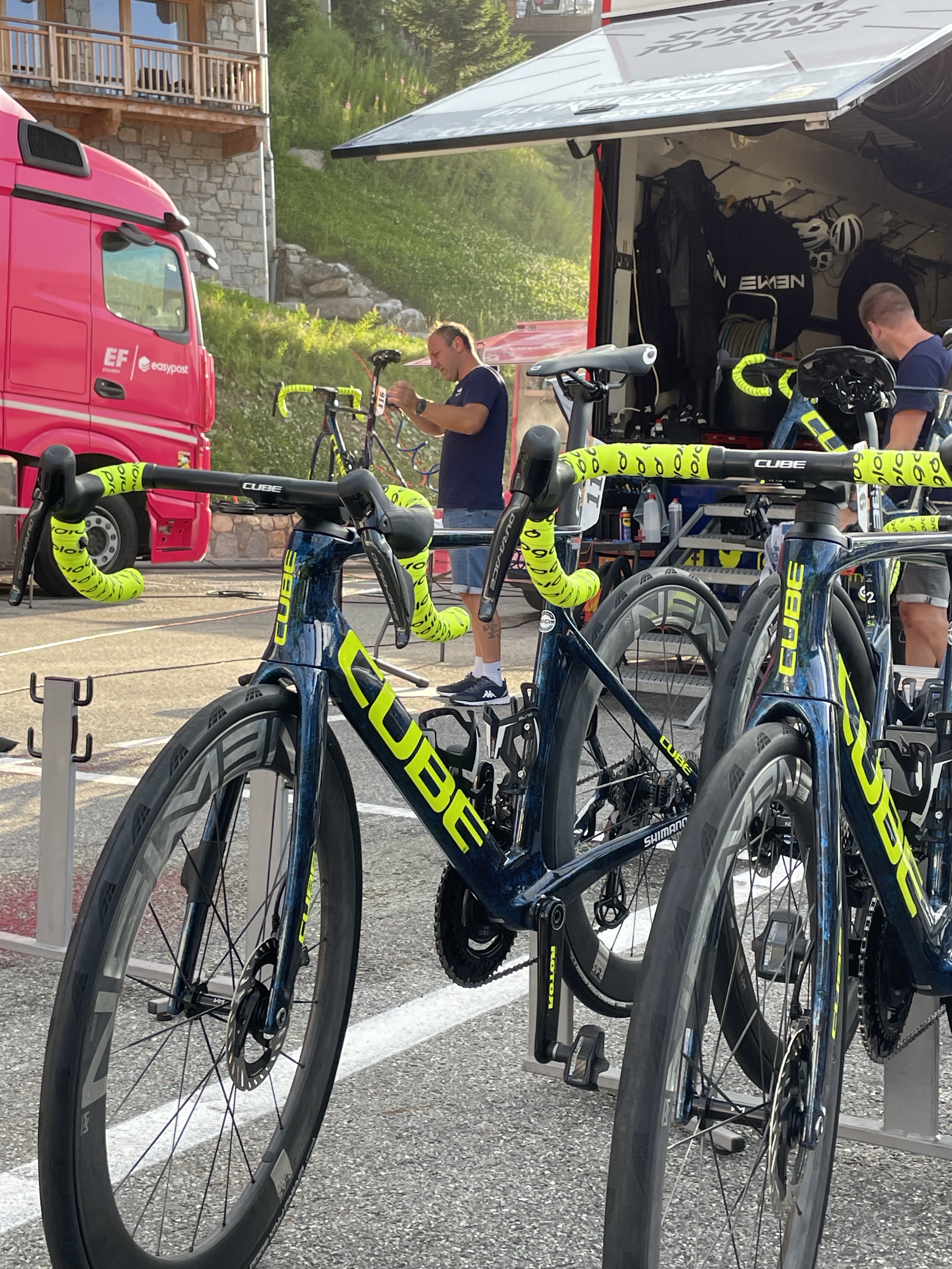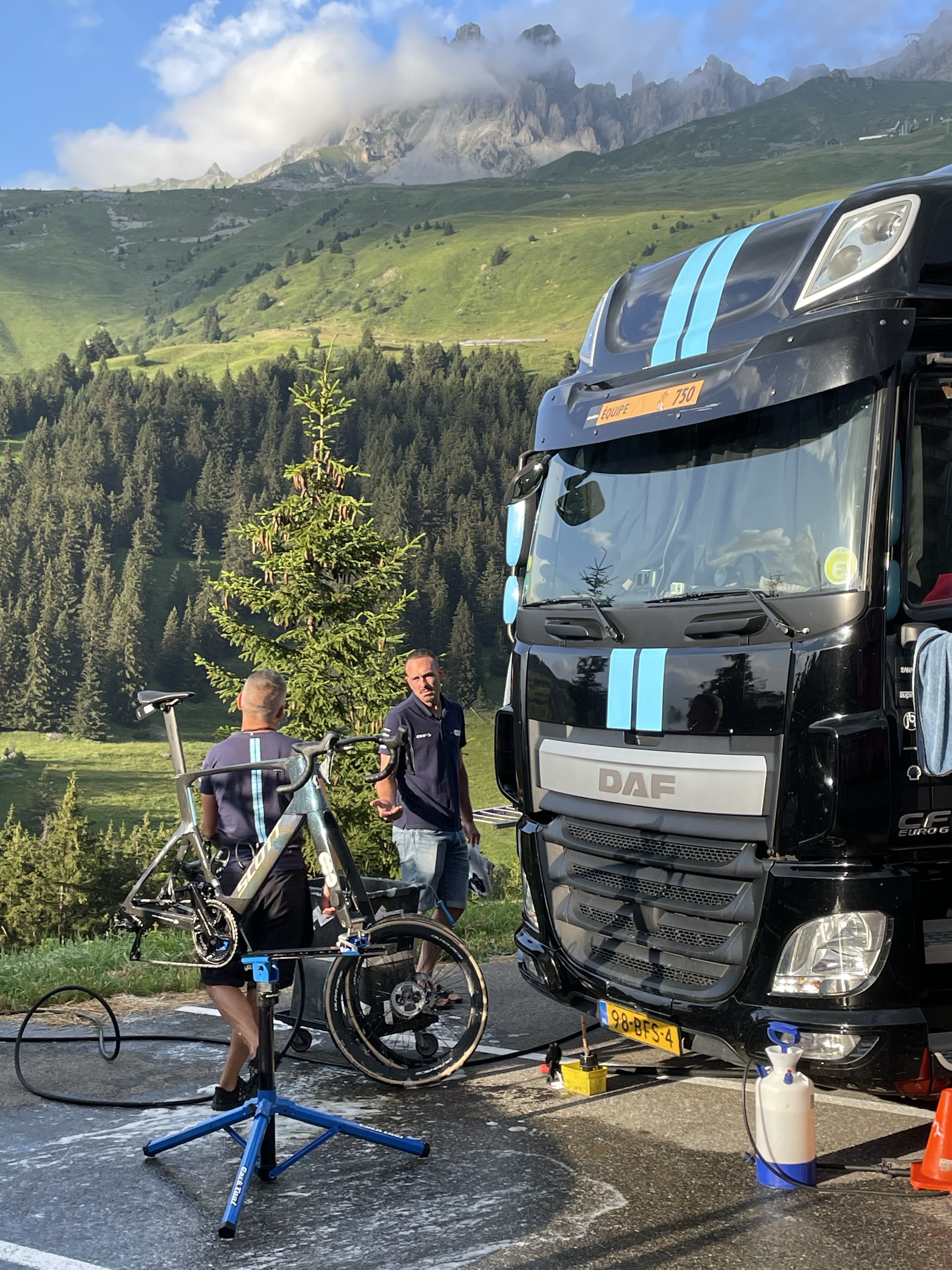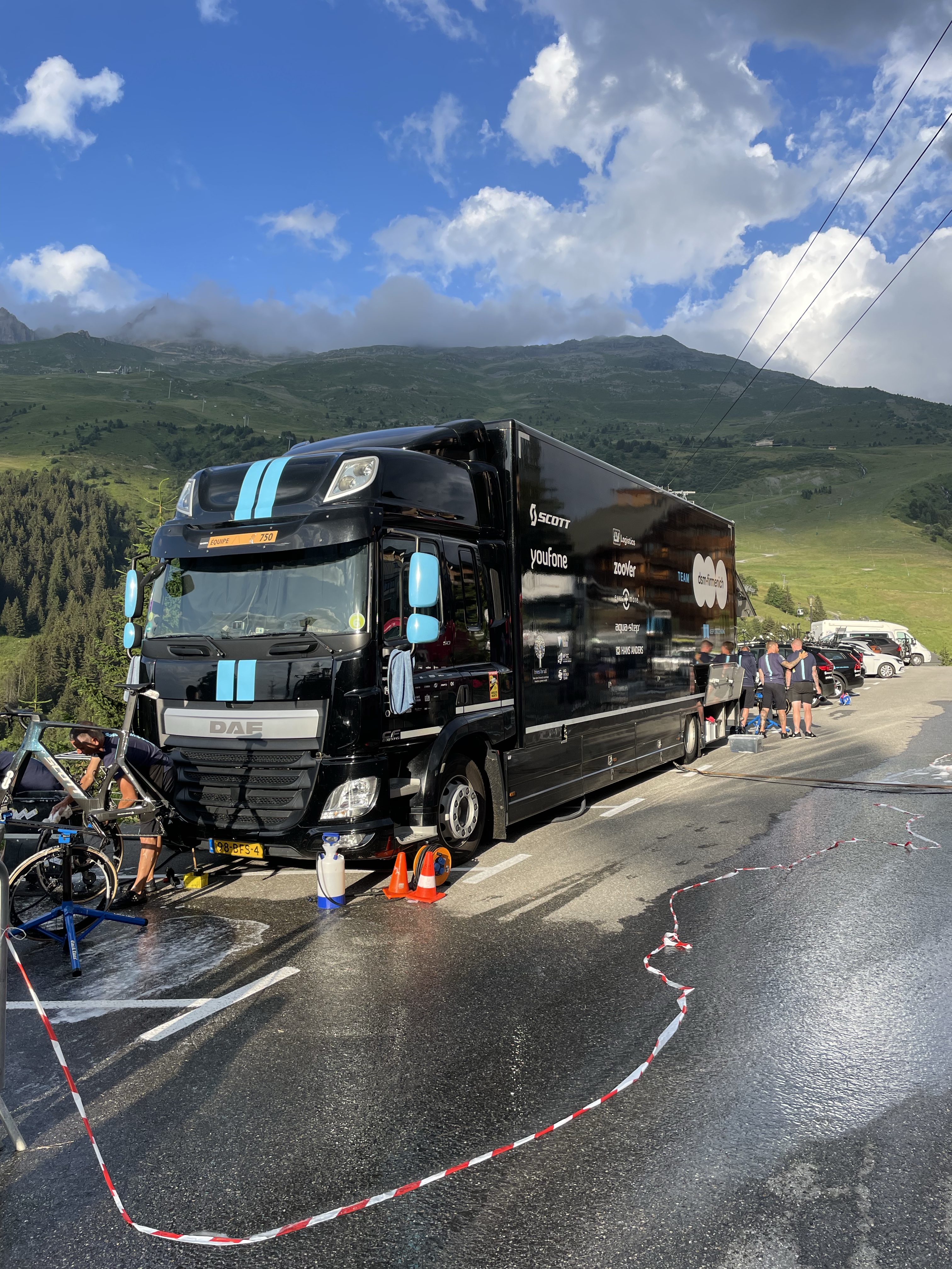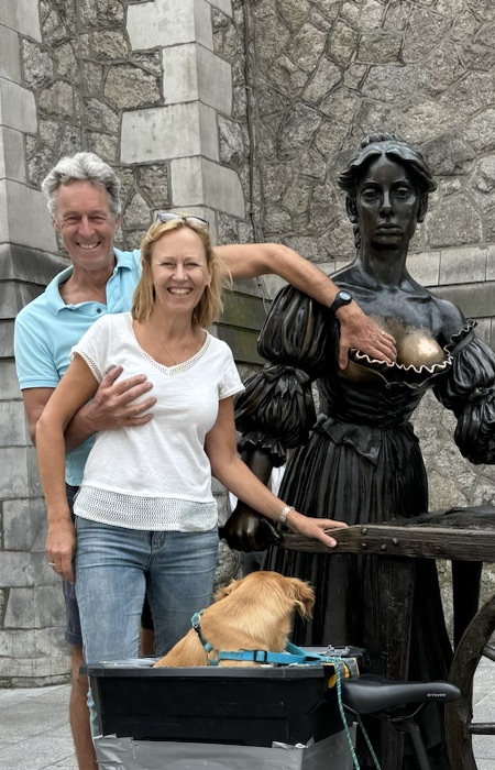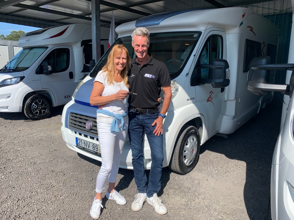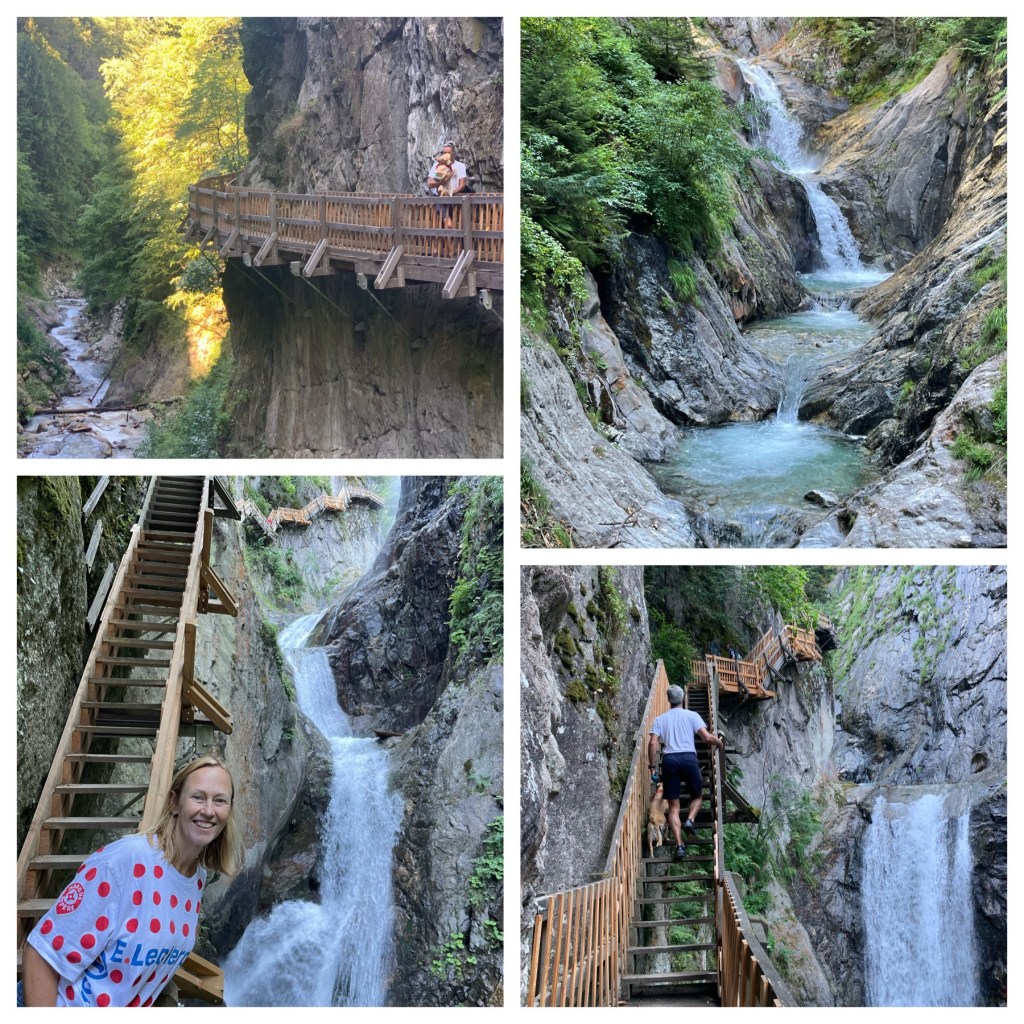 But there were two other highlights at Arromanches which were especially memorable. At low tide there were always lots of military vehicles of all shapes and sizes driving around the beach which was fun to watch from the sea wall. The MVT put on a great display one afternoon with all 350 of their vehicles together with lots of their enthusiasts dressed up in military uniform and 1940s fashion and music and we enjoyed being in amongst everyone and soaking up the wonderful atmosphere. As Skye was parked up and we were on our bikes, we took the opportunity to cycle up and down the beach with Sandie in her ‘tub’ on the back of my bike with her Union Jack shade – being the consummate professional that she is, she got lots of attention which she naturally took in her stride and even ended up on French TV – TF2!