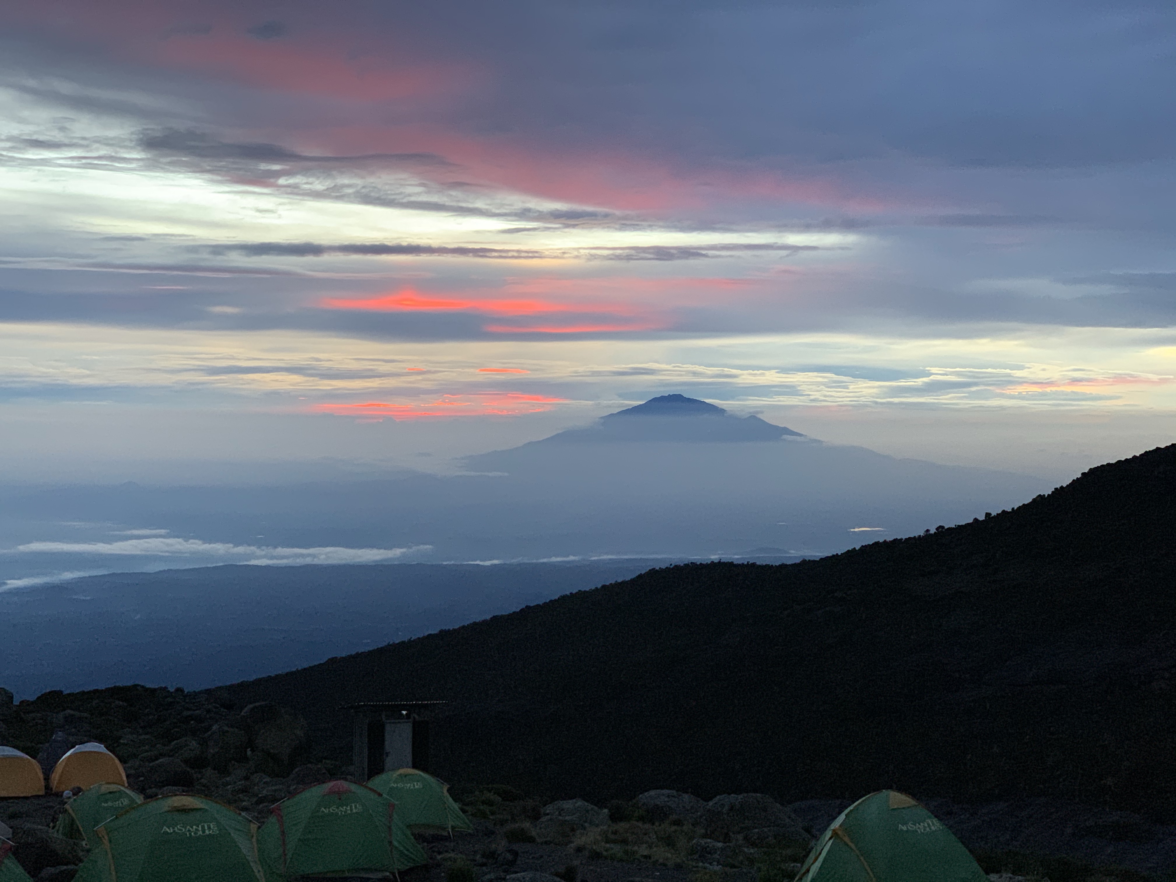 After our first day of navigating the rainforest torrential rain (a good way to discover just how waterproof our âwaterproofsâ actually were!), we were treated to a beautiful clear sky and views of Mount Meru for Day Two. The views were breathtaking which made the 5.5 hours of uphill hiking much more palatable – as did the hot lunch of chicken and chips which greeted us on arrival at Shira Camp. Our entire group were in total awe of the stupefying strength and athleticism of the guides and porters who supported us on the mountain; most large loads were carried on their heads and yet they were still able to race up ahead to set up the tents, mess tent and have a hot meal waiting for us. Quite extraordinary! What was also so wonderful about these Tanzanian mountain men and women was their smiles, chanting and their SINGING! To hear 115 voices singing in Swahili was something never to be forgotten and certainly very motivating on the mountain.