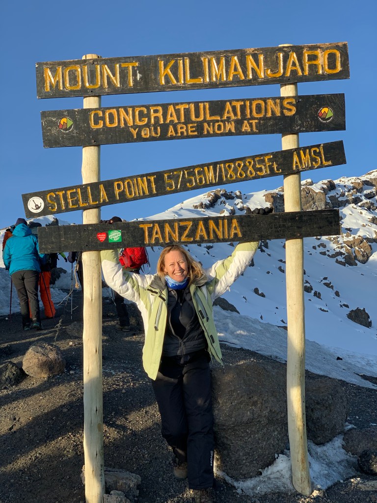 Day 5 and this is it, Summit day; this is what is all about and this is the moment when we discover if we have the mental strength to overcome our physical pain! We have a rare lie-in (6.45!) and short 3 hour hike to Base Camp, situated at 4600m. Our acclimatisation is going well, as we are less out of breath than at our high lunch stop a couple of days earlier, but even so, the most simplest of tasks leaves us all out of breath. The worst part is lying down, when you can feel your chest heaving, trying to find more oxygen, but to no avail. Unfortunately, this is exactly what we have to do all afternoon, as we are meeting at 10pm for dinner, ready for our Summit attempt at 11.30pm. We all struggled to sleep, but rested our bodies and tried not to worry too much about the nightâs endeavours. After the best mashed potato and bean stew Iâve ever tasted (not that our taste buds perform at altitude, but it was the perfect fuel!), we all assembled with our headtorches on and wearing all our layers to combat the cold. We set off from Base camp, a long line of lights traversing up the mountain – and by up, I really mean up…..this was the steepest terrain weâd encountered so far. And it just kept on going……and going. I tried not to look up too much, as it was almost beyond belief that the torches I was seeing above me were on the track that I must climb myself – it seemed as though they were in the clouds! At no point did I ever feel that I was going to allow myself to stop, so I had no choice – it was just one foot in front of the other, one âzigâ and one âzagâ, one chunk of the mountain at a time. The guides really came into their own on this night and were full of songs and motivational chants to keep us going – they also regularly checked up on us to make sure that we werenât suffering from altitude sickness. It was a change for the, as for 5 days theyâd been wondering how this group could still find things to chat about, but now we were mostly silent, conserving our energy for what lay ahead. There are moments from this night that will stay with me forever; the moon rising to help light our way; the twinkling of lights from the towns and villages in the valley; the stars in the sky shining so brightly with no light pollution to dim them; the endless line of headtorches snaking their way uphill and coming up from the valley. We were instructed to go âpole poleâ (slow slow) and this was the only to go – it just seemed endless and we were really beginning to draw on our reserves. We only had 3 stops on this entire night, as the moment we stopped the cold set in, so it was best to just keep going. As we got higher, our water bottles turned to slush and frost could be seen shimmering on our packs. The dawn could not come a moment too soon and was such an incredibly beautiful and inspiring sight, beginning to take the edge of the chill and help us see that the end was almost in sight. So, after 7 hours of the most gruelling, intensive slog, made doubly so by the rarefied air, we made it to Stella Point, on the rim of the crater.