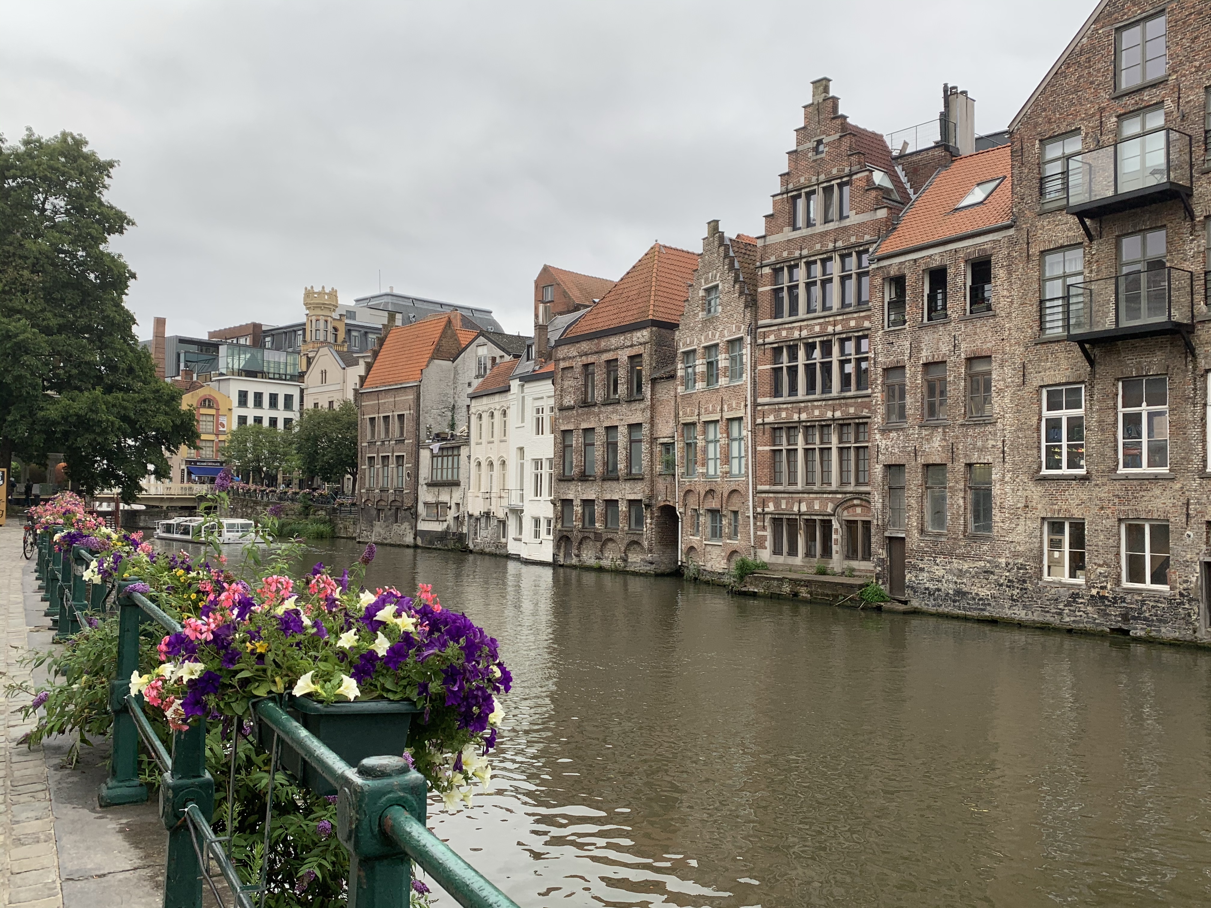 It’s the start of my big European road-trip and Gloria is nowhere to be seen. I’m squeezed between huge artic lorries walking along the vehicle deck, just about to arrive in Calais and there’s still no sign of her; she’s used to crossing the Channel, but is generally the bigger vehicle, surrounded by smaller cars. But this is a post-lockdown world and there are still very few passengers onboard, so Gloria is feeling a bit intimidated by all these enormous lorries all around her. However, once located, she is keen to get off the ferry and head off to our first stop in Belgium, Ghent. The advantage of the lack of passengers is that there is no queue for food and, more importantly, there are tables available at the front of the ship to watch France come into view whilst eating my boxed fish&chips. The disadvantage is having to wear the mask everywhere…..
