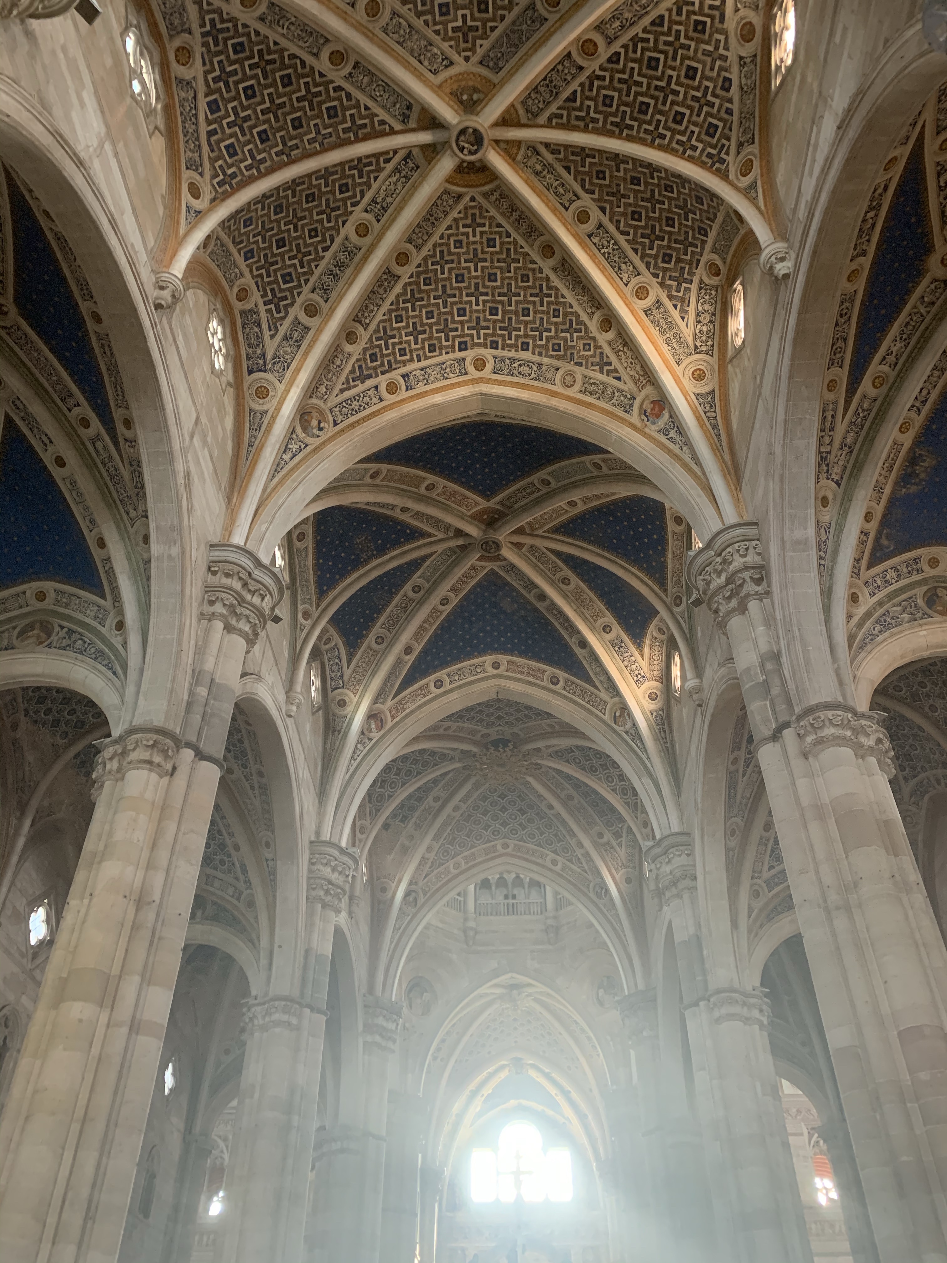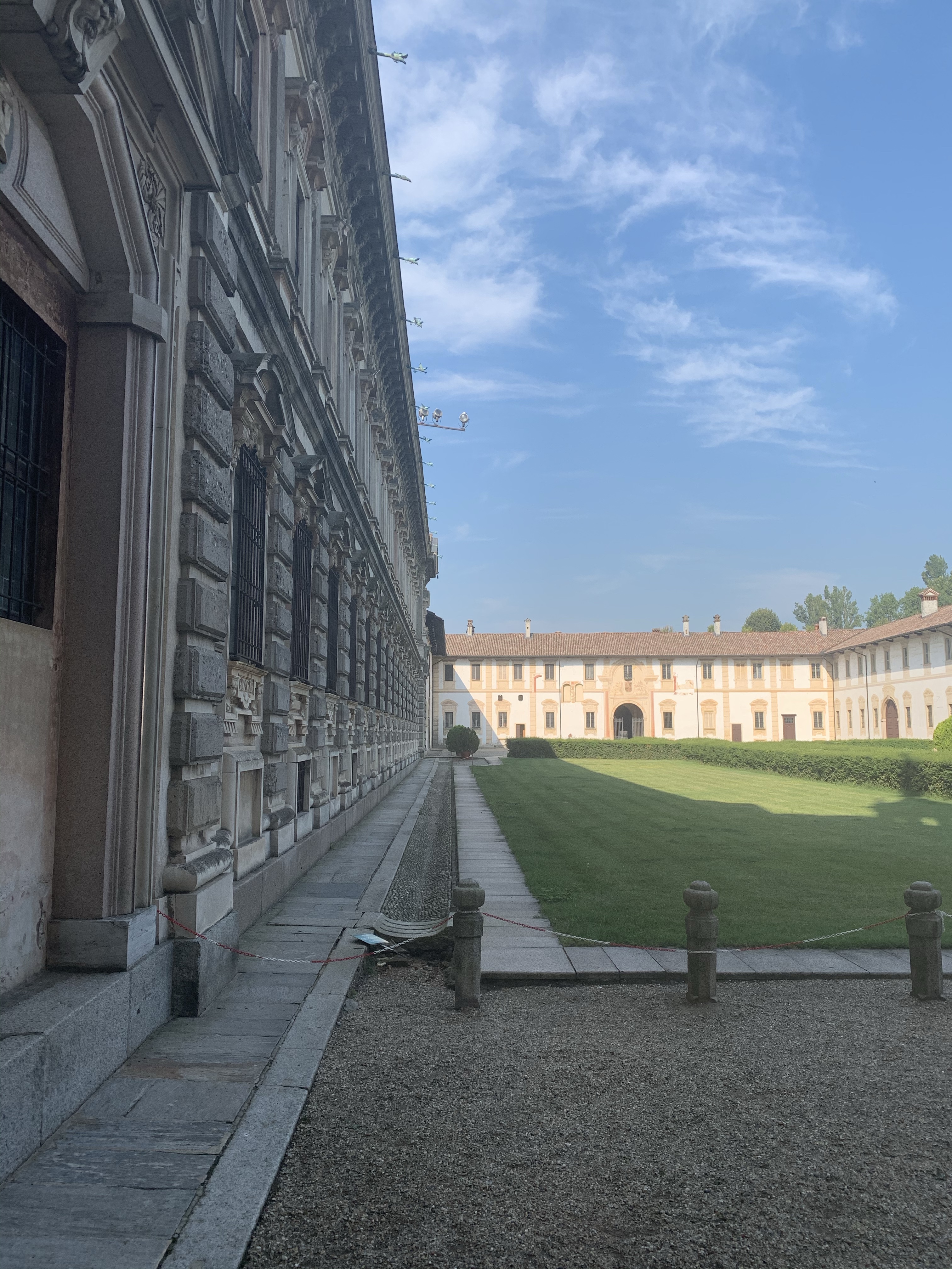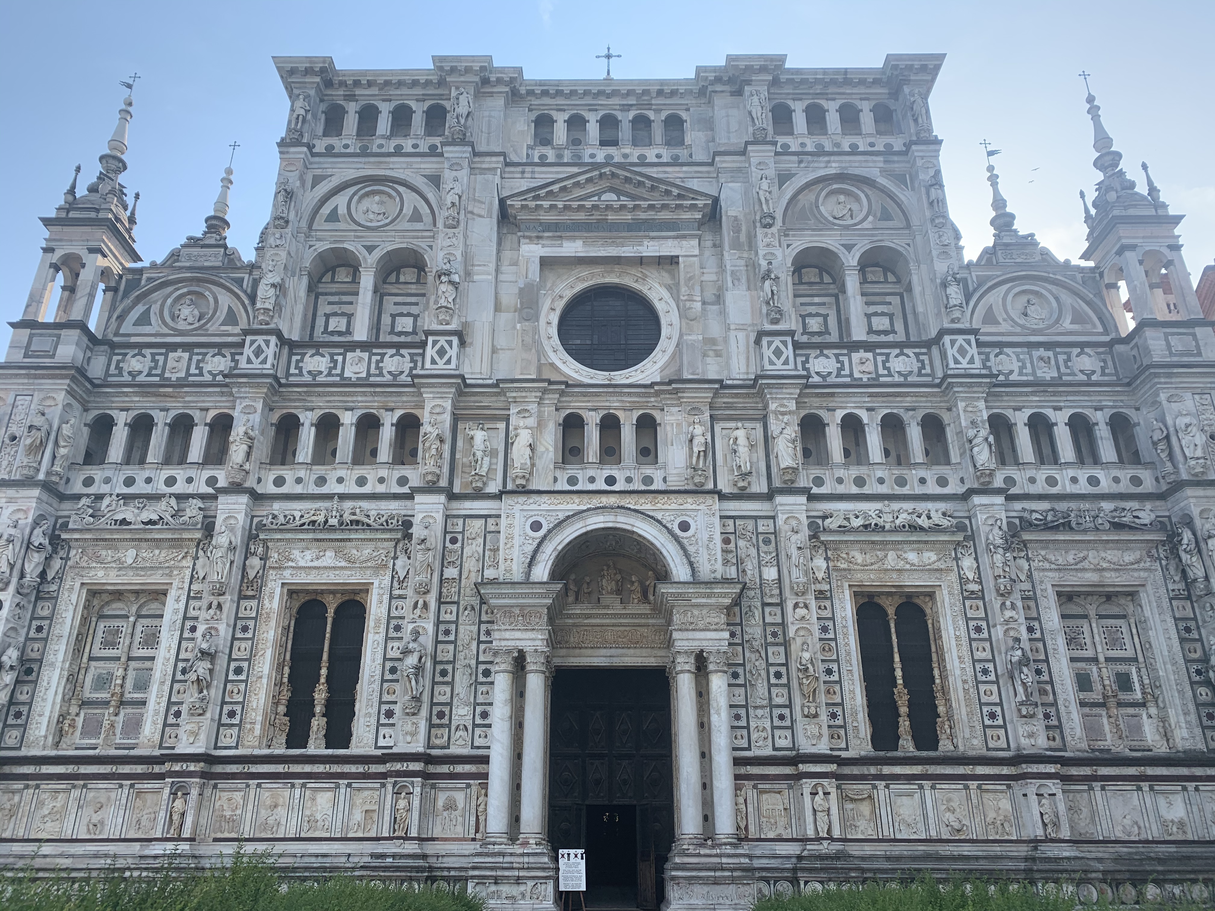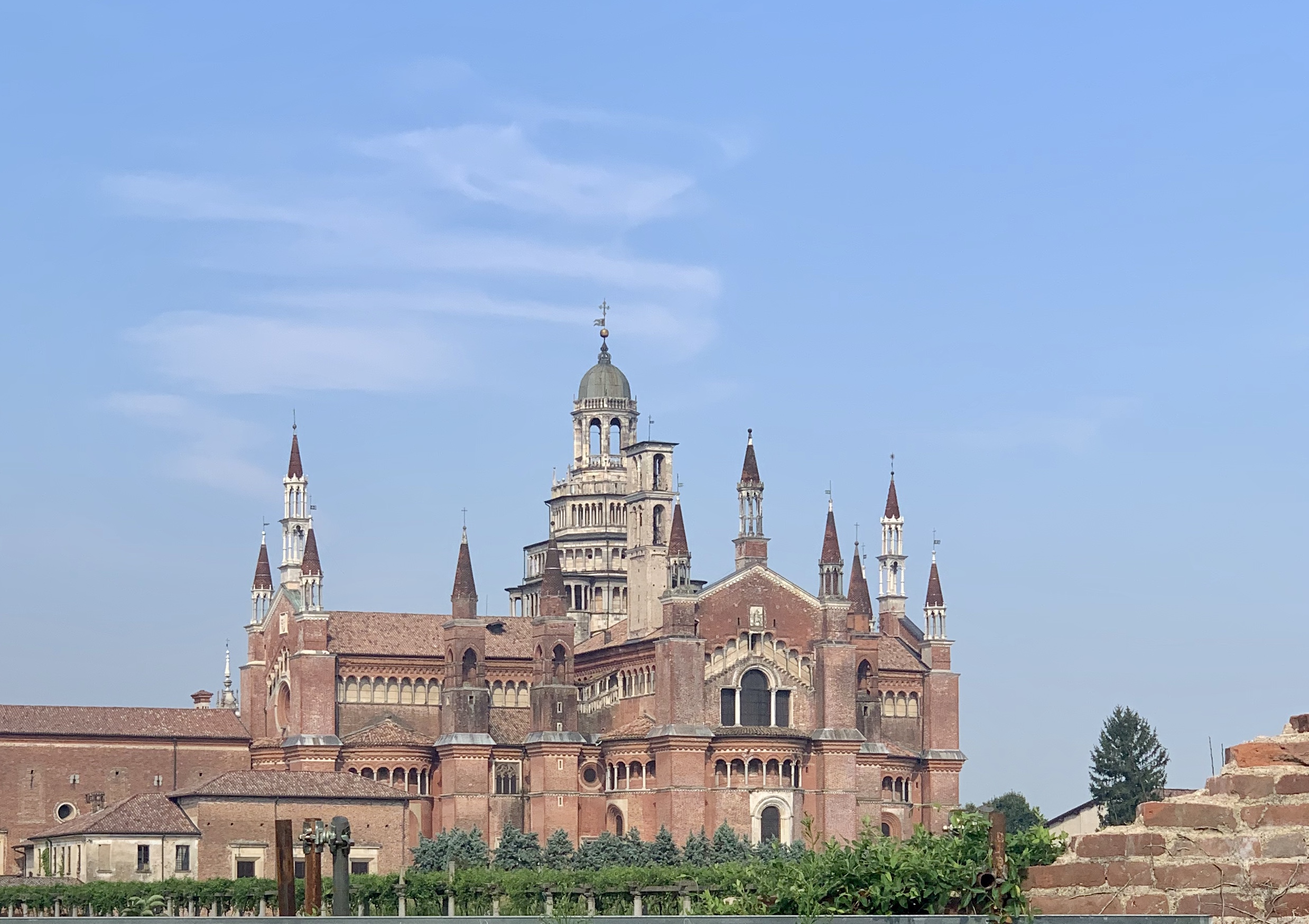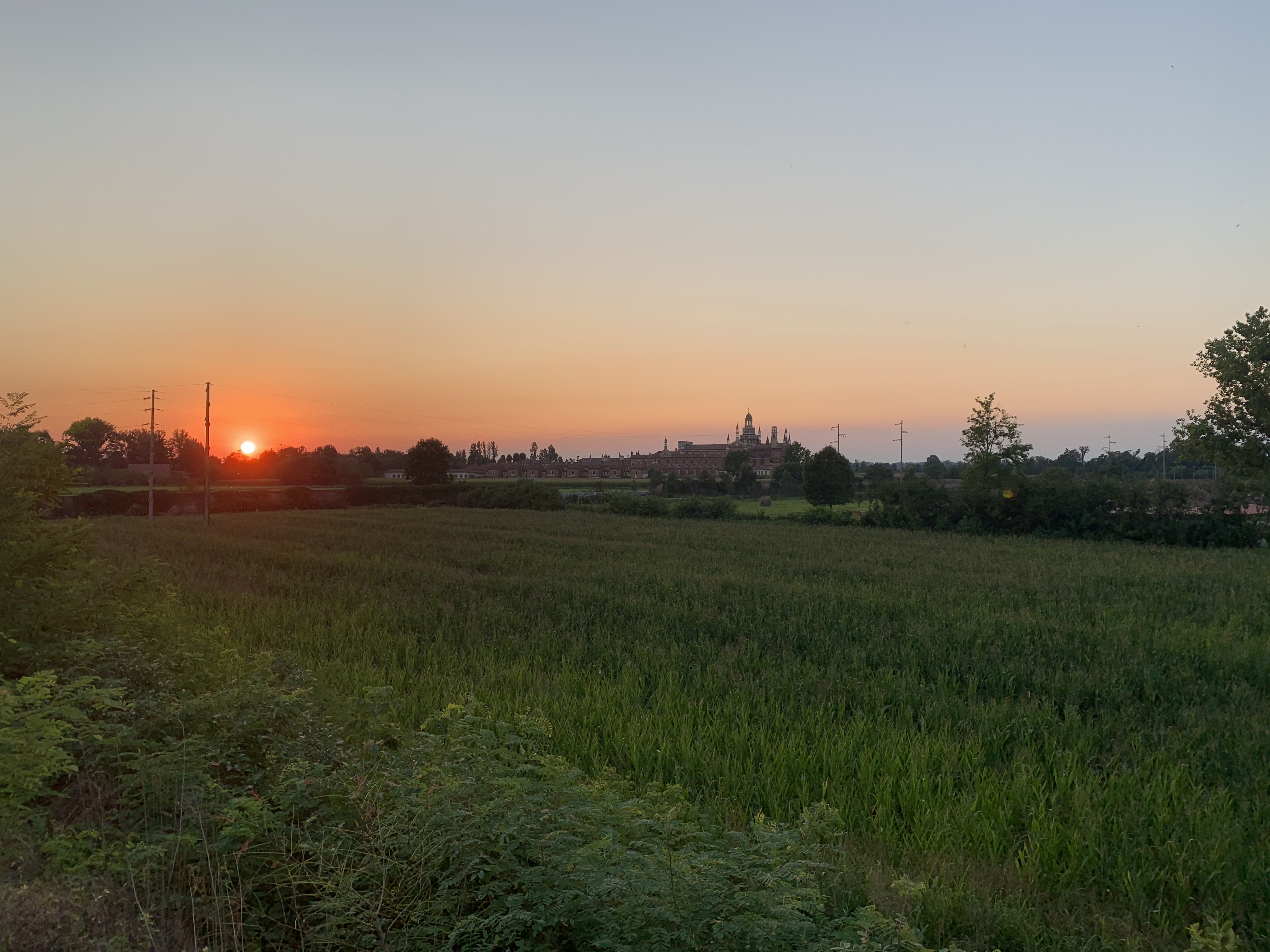 The pair were introduced to wild camping straight away with a spot near the Certosa di Pavia, Lombardy and we were treated to a superb sunset over this intricately carved monastery before dinner onboard. We discovered that weâd been a bit too late pulling across the mosquito netting over the doors and windows, so it became like the killing fields inside Gloria as we tried to rid her of all the bugs. Added to that, it was HOT đĽ , but that didnât prevent the teenagers from managing to sleep through my morning ride into the local town, coffee in a cute cafe and visiting the monastery, also known as the Charterhouse.