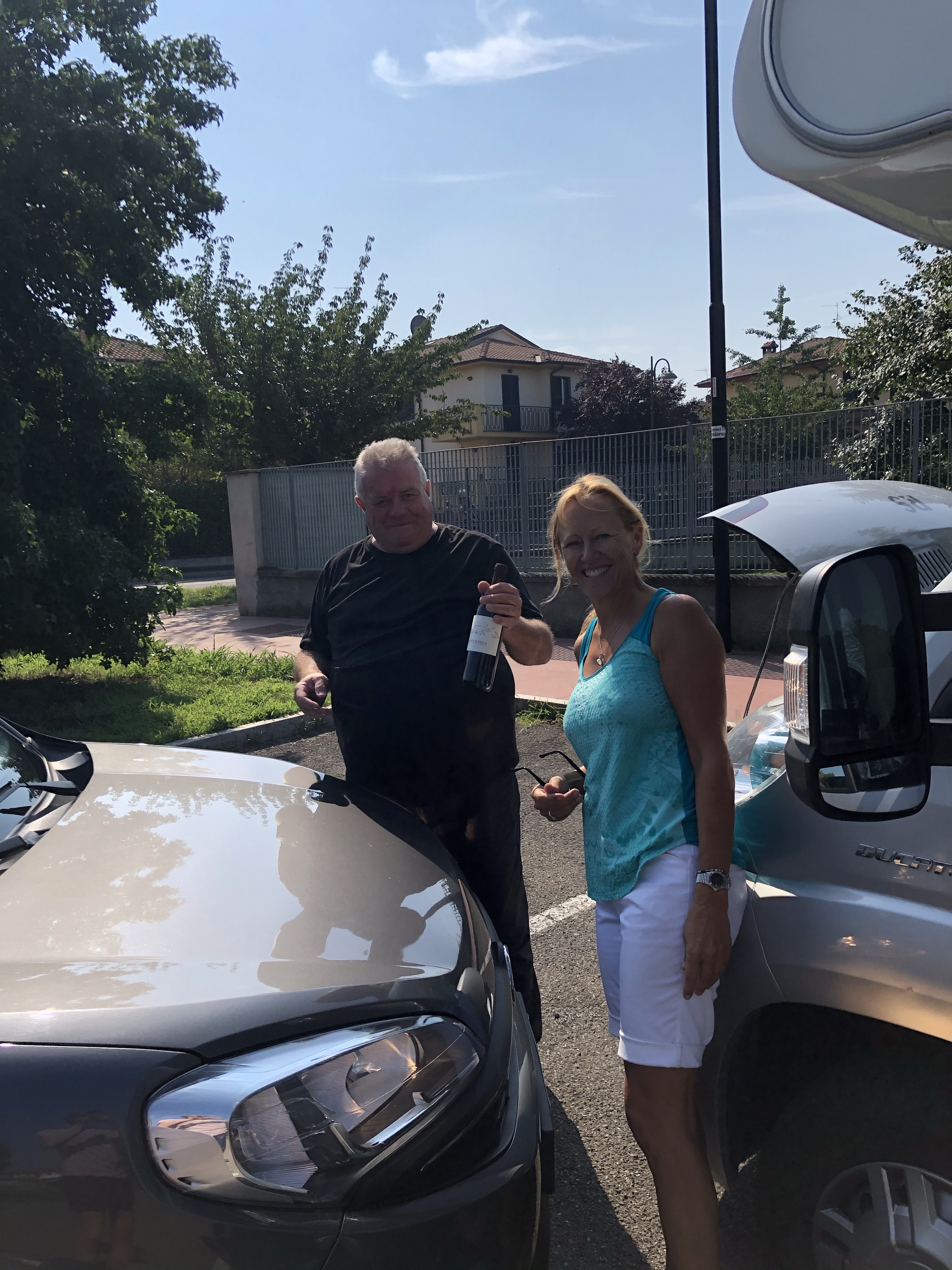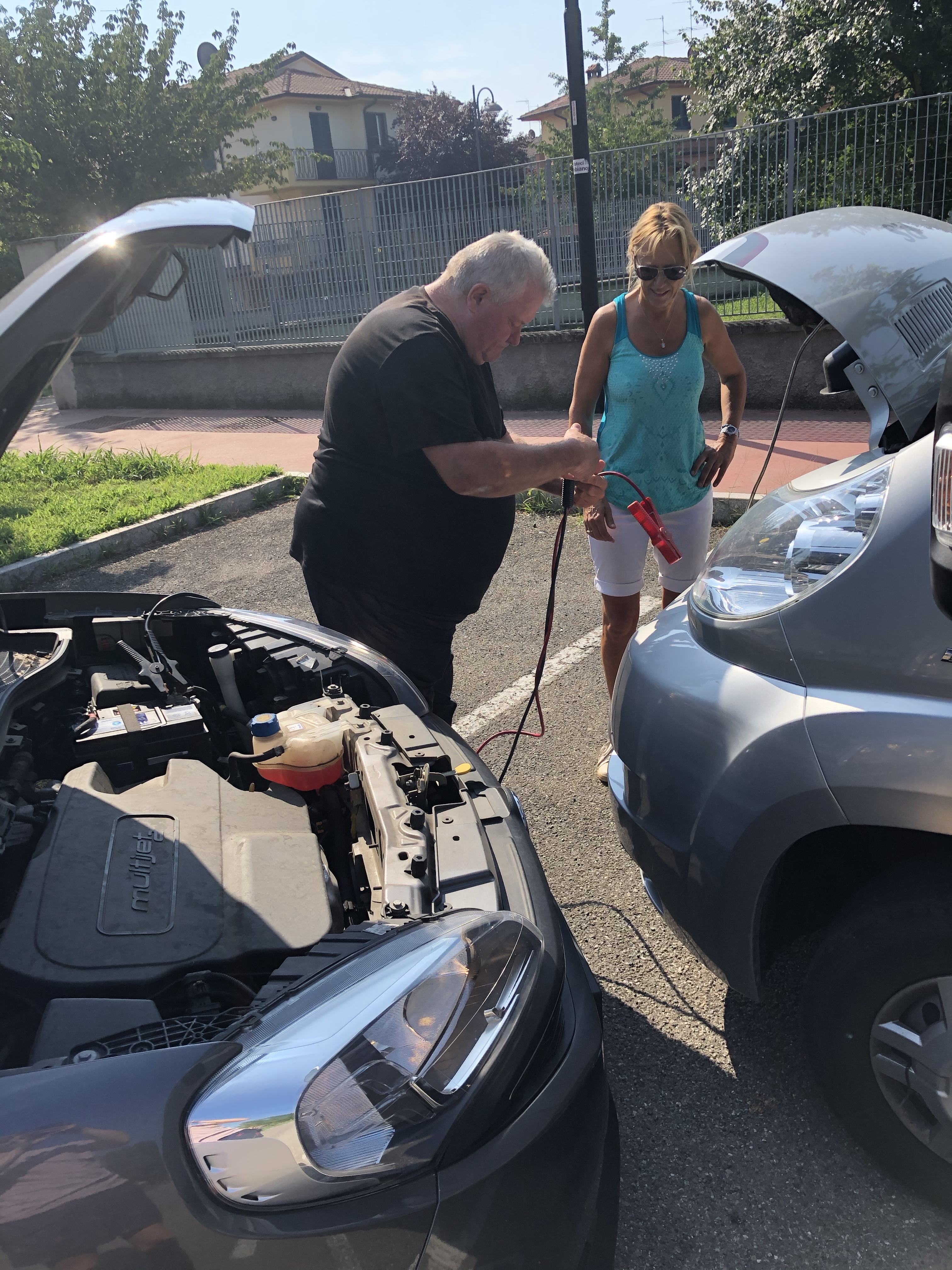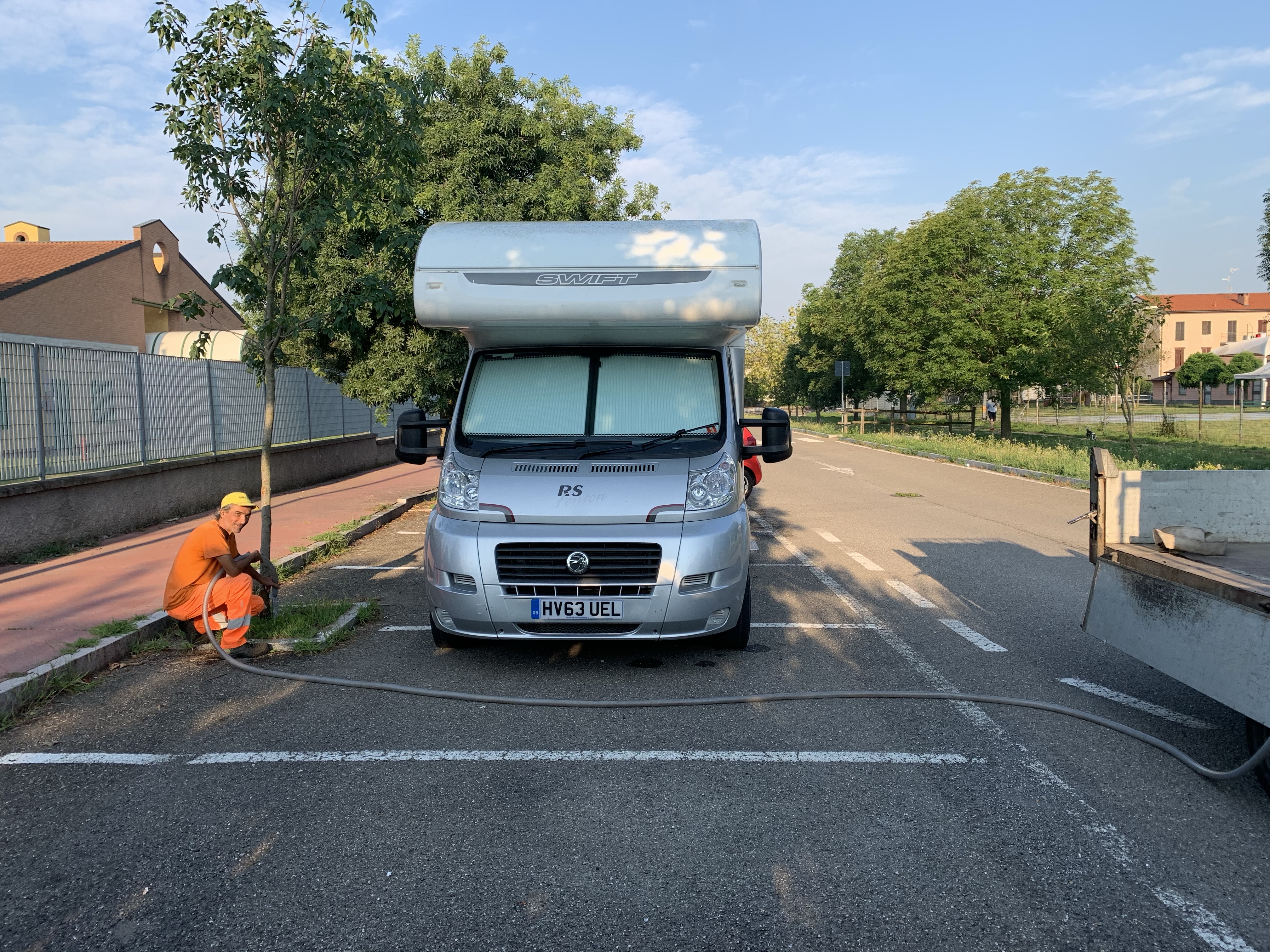 By the time I returned and it was time to go, the fan had been on for over 12 hours – against my better judgement, I had relented and let the teens use the fan, thinking that it came off the Leisure battery. However – youâve guessed it – it must have been the vehicle battery as, when I went to start the engine, she gave a momentary splutter before completely dying. Gloria was NOT happyâŚâŚand we were in the middle of nowhere đą Reluctant to call my Breakdown services straight away in case they took ages, I decided to go off in search of some jumpleads; my first victim was the local road sweeper, dressed top to bottom in fluorescent orange and totally bemused by my initial attempt at explaining my predicament with the aid of google translateâs Italian words for jumpleads, as he simply pointed to the sky (what on earth did it say??!). After some theatrical charade-worthy âengine not startingâ actions and sounds, he finally got it and headed off into the residential neighbourhood. So, I found myself following Fluorescent Orange Man to the home of a man boasting an enormous belly covered solely in a pair of braces. After much gesticulation and rapid-fire Italian, Fluorescent Orange Man indicated that his big belly friend would help me, so I returned to Gloria wondering what would happen next. Sure enough, ten minutes later, Mr Big Belly (fortunately covered in a T shirt now) manoeuvred his own little Fiat close to Gloriaâs nose and, in no time there was the glorious sound of Gloâs purring engine. What a relief and certainly worth the bottle of wine that was handed out as our thanks. Rookie Error #2: always keep a set of jumpleads onboard and donât leave the fan on all night!