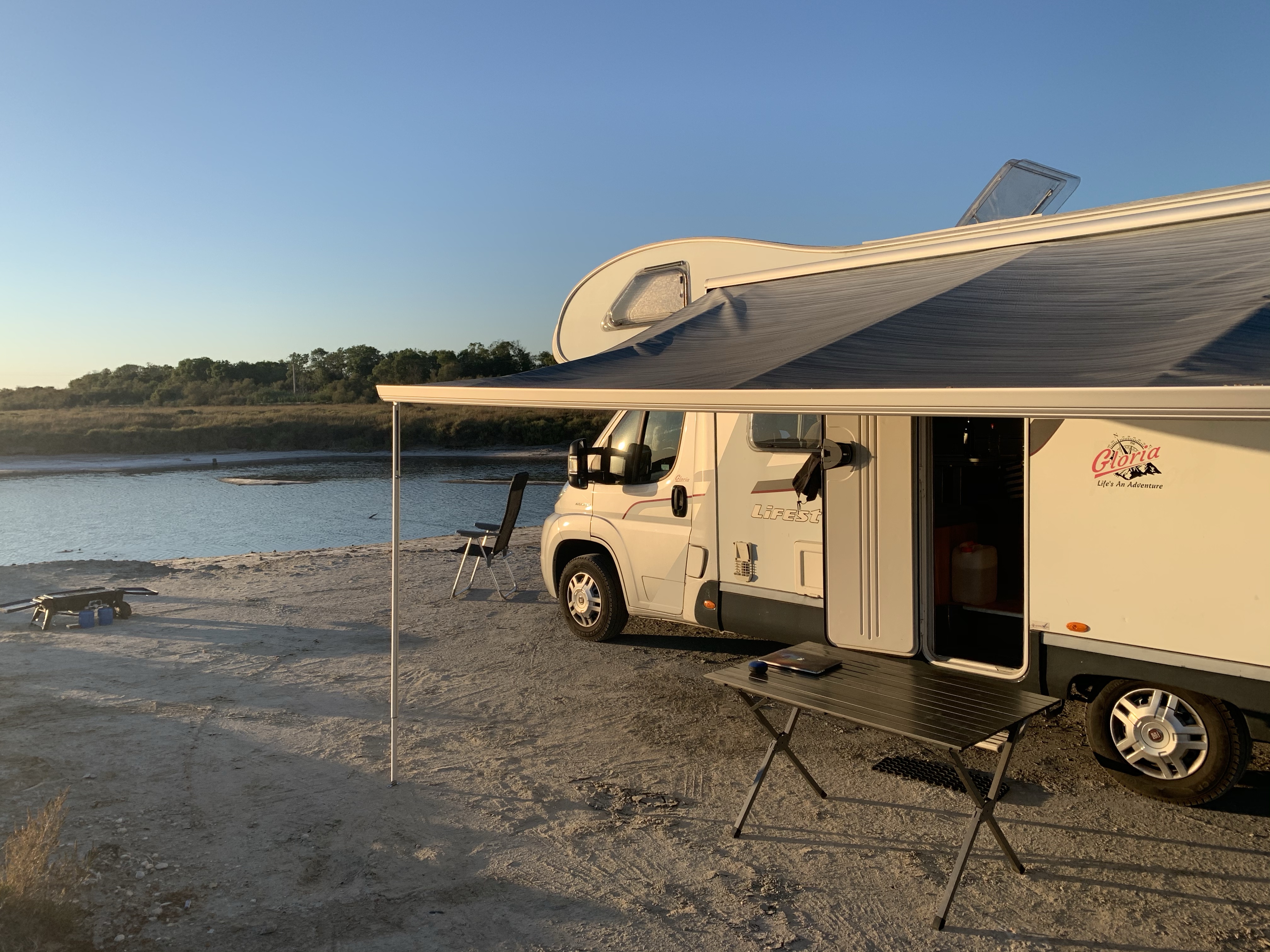 Next stop was the moonâŚ..or what it could look like, as I found a camp spot right on the waterâs edge near the large salt flats of The Camargue, an area better known for its white horses (none spotted – apparently a bit of a touristic ruse now)