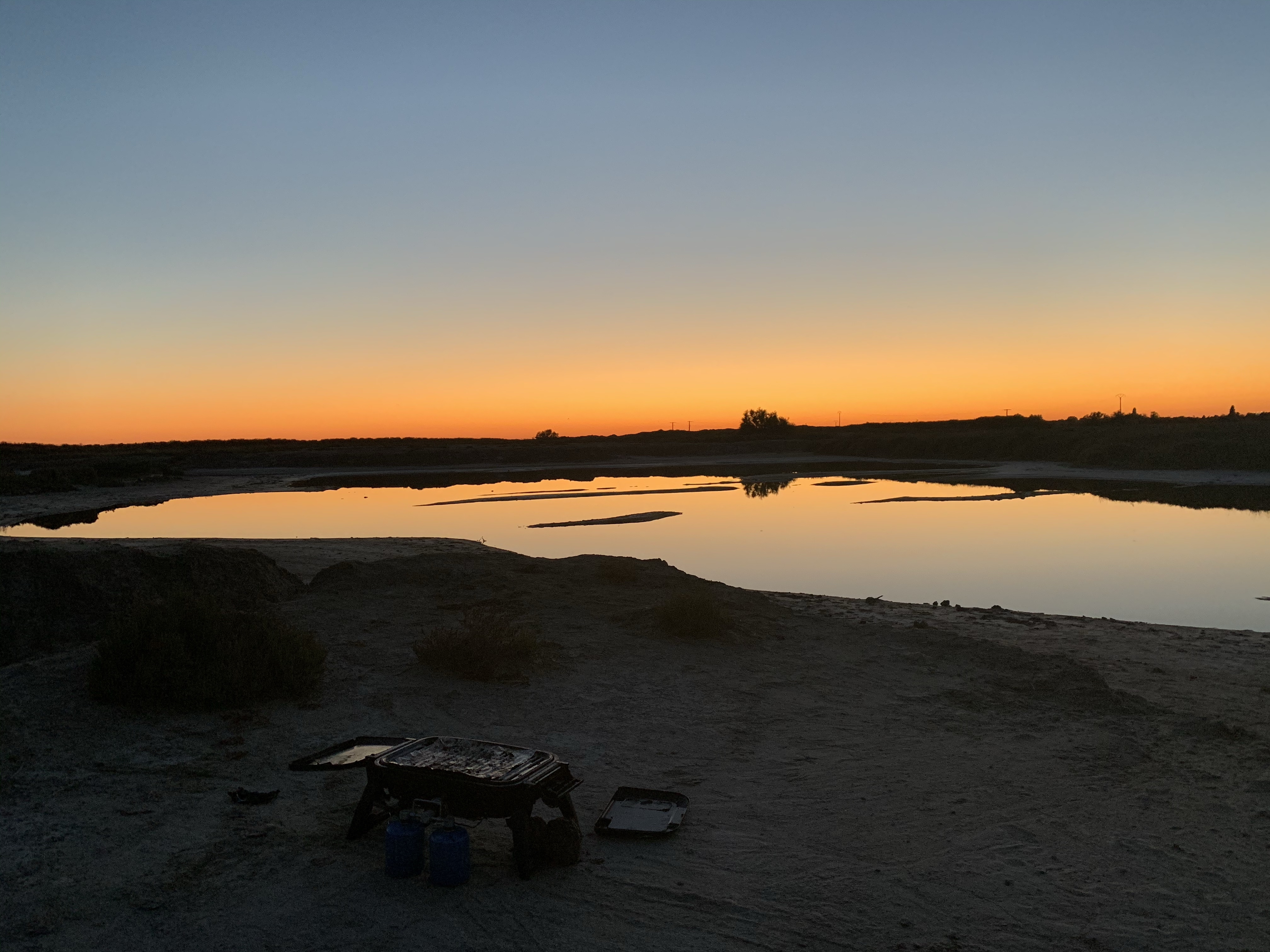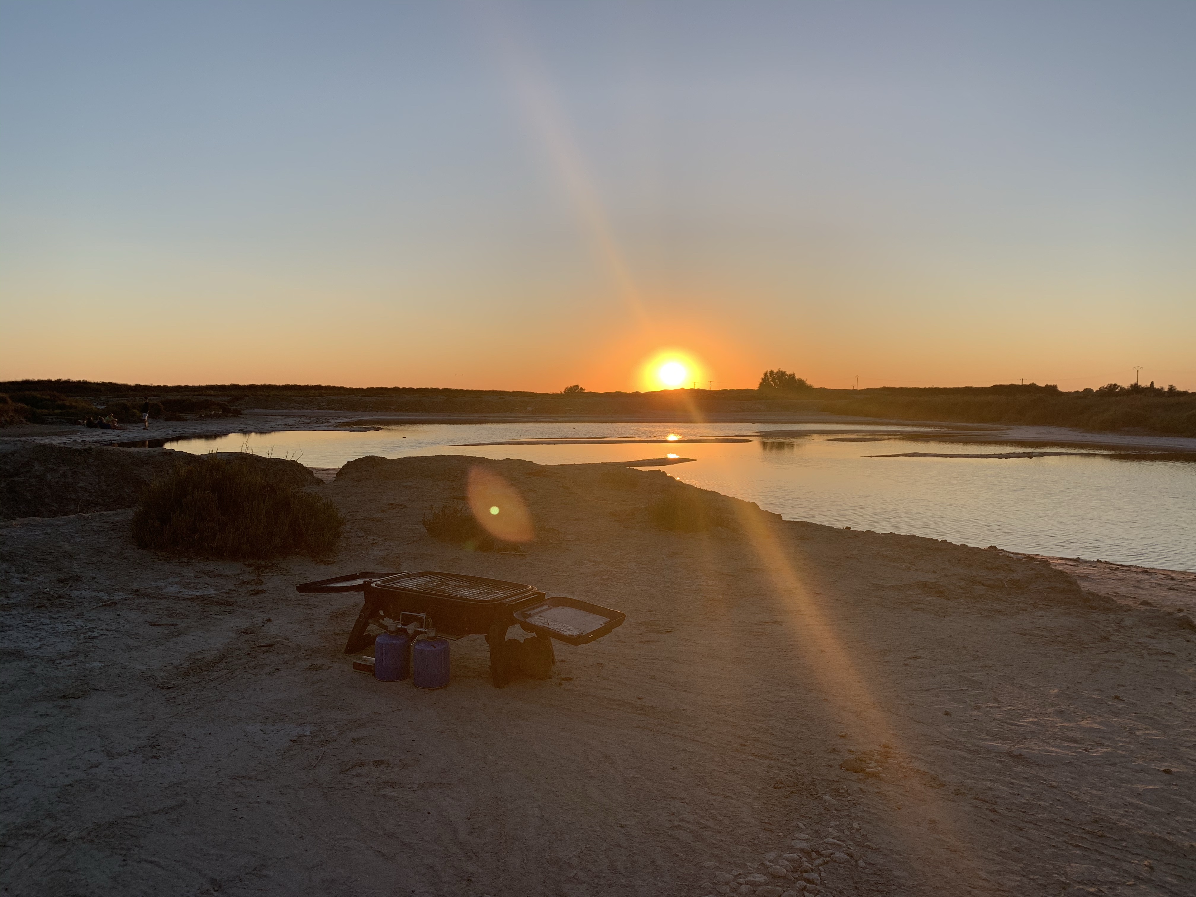 The vibrant pink salt lakes produce over 500,000 tons of salt every year and thereâs a reason why the salt dries out hereâŚâŚitâs baking hot! đĽ So, onto the bike I jumped to cycle through the strange lunar landscape in search of the beach and what a disappointment that turned out to be, jam- packed with hordes of people and barely a space to walk. I made a quick U turn and biked back up the river and found a tranquil spot by the River Rhone with not a soul around – how much better and thank goodness everyone else doesnât like to be âoff the beaten trackâ like meâŚâŚ especially as I was able to wash my hair with no one else looking! Refreshed and clean, I celebrated by getting the barbecue out and enjoyed writing my blog watching the sun going down.