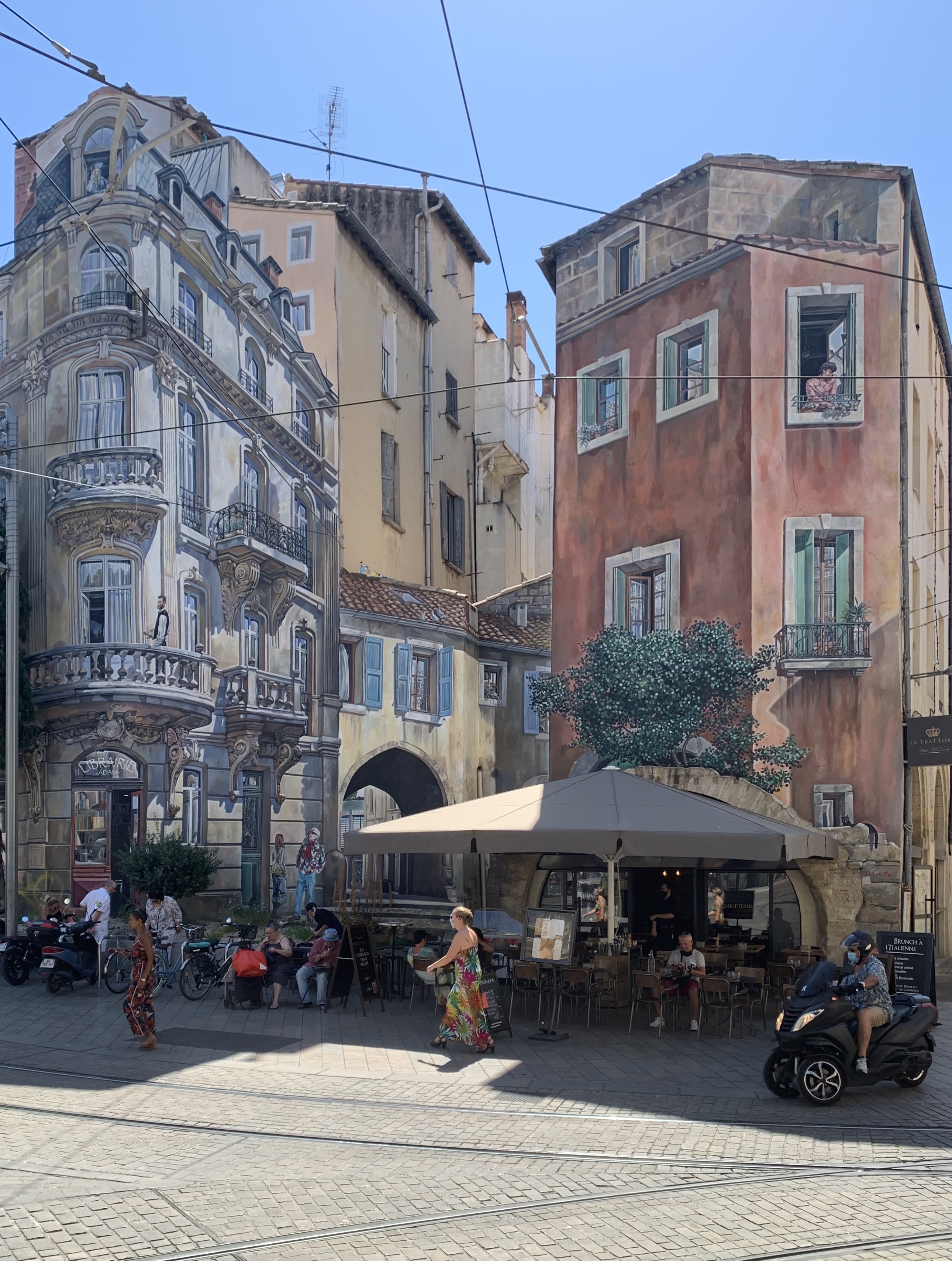 The standout moment of the visit to Montpellier resulted after cycling through a narrow uphill street, changing gear and getting that sinking feeling, knowing that the chain has come off. This has happened a few times on Scottie (Emmaâs bike), but could always be solved – however, this time, after lots of tugging and even releasing the entire back wheel, it could not be budged. You would have thought that a maiden in distress with black oil all over her hands would have elicited more help, but everyone walked on byâŚâŚuntil, finally, a French man start talking to me. Was this my knight in shining armour? No, it was just someone who told me (in perfect EnglishâŚ..I must improve my French!) that there was a bike shop just around the corner. Only I could break down and find that less than 20m away was Tall Bike Guy who really knew his stuff and straight away whisked Scottie onto his rack for diagnosis. Judging by the fact that all the cogs were on the floor, I ascertained that this was something that I could not have done myself! Tall Bike Guy was so nice and helpful, telling my all about the big bide ride that he was about to do to Britanny, sleeping in a hammock enroute (and I thought I was mad!) – it only took about 20 minutes to fix, but I could have sat and watched him fix it all afternoon!!!