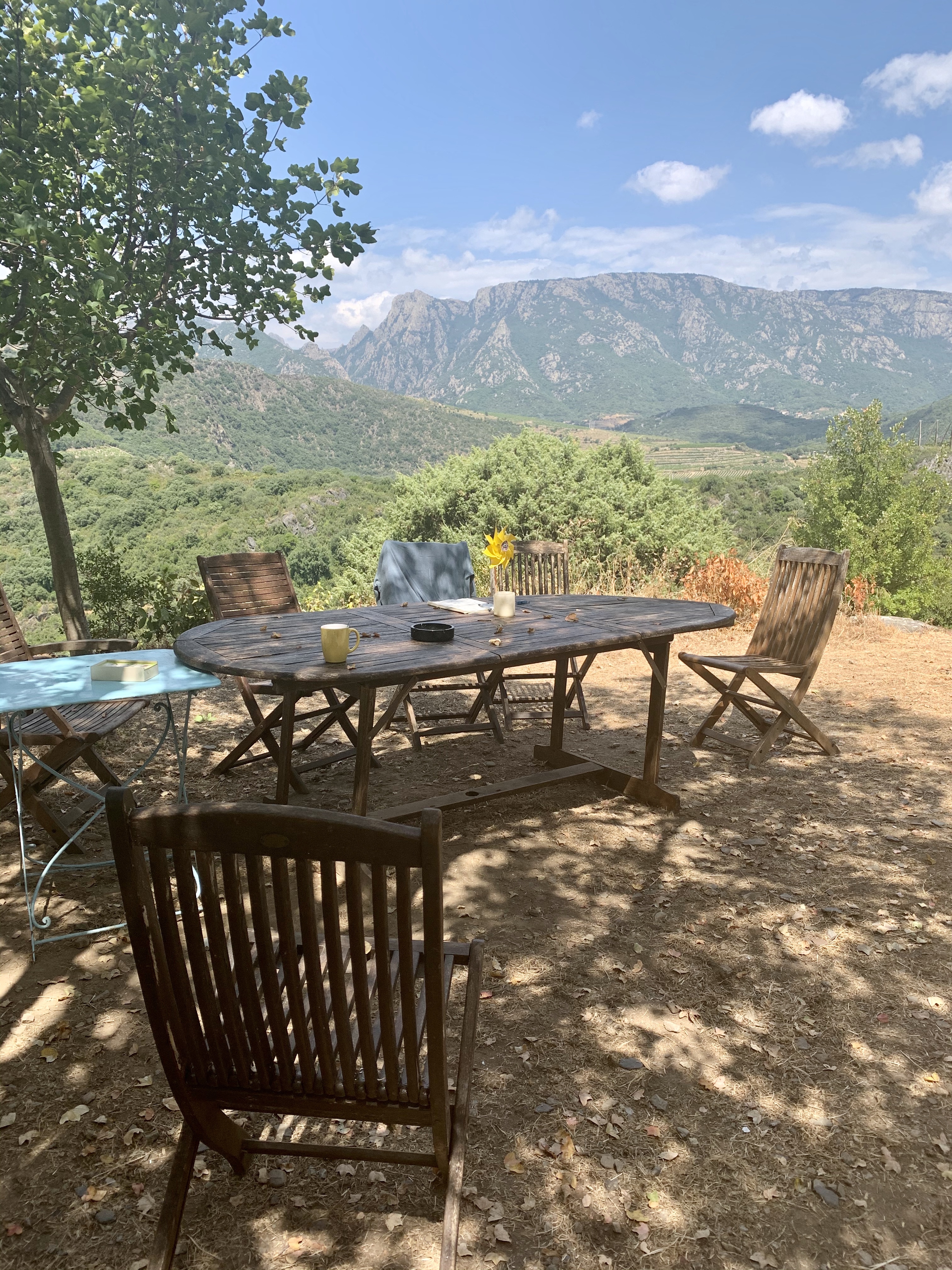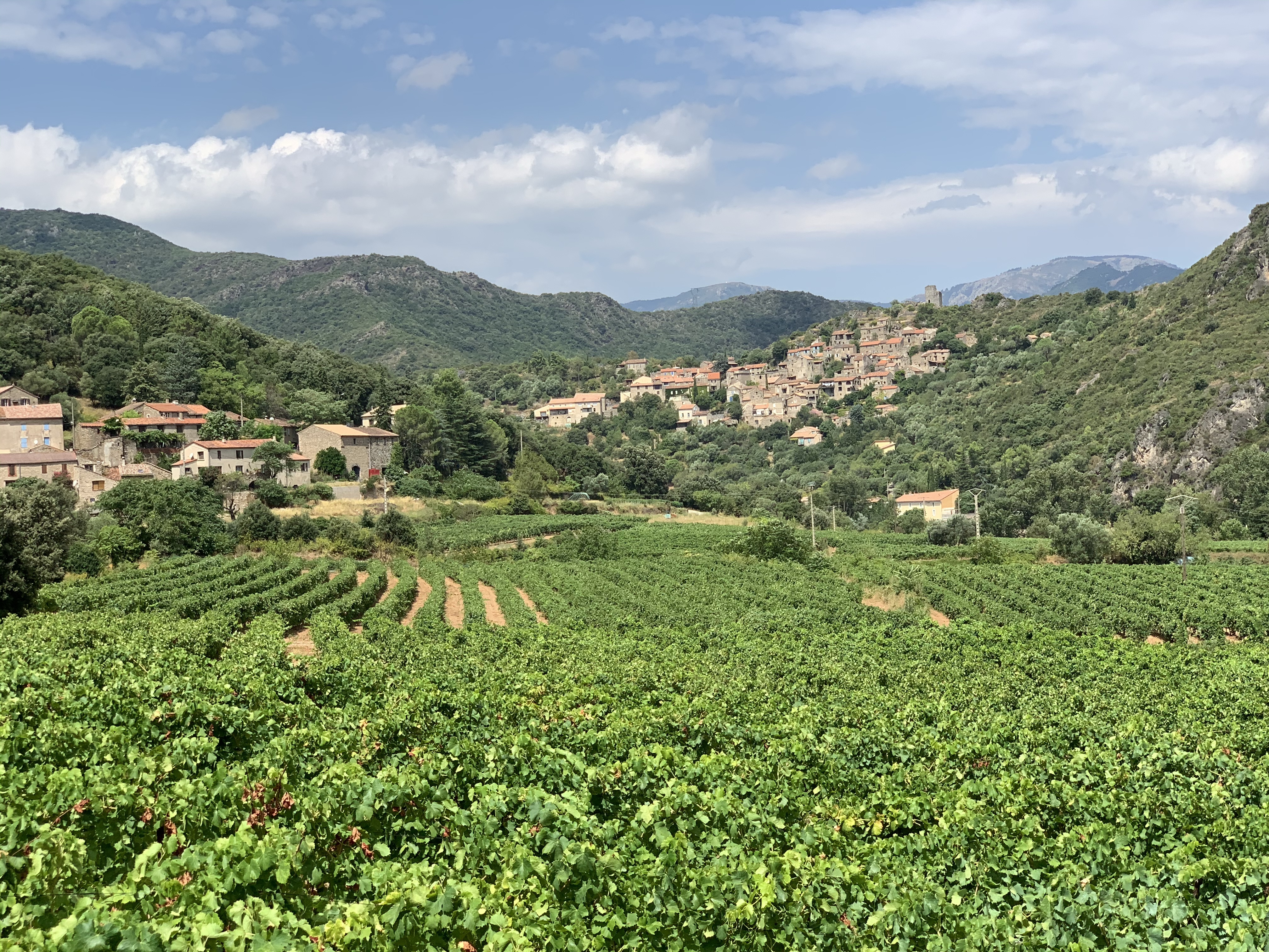 Feeling a bit deflated, I fired Gloria back up and pointed her towards the mountains, along some beautiful country lanes with grapevines on every spare spot of soil and plenty of red (burgundy??!đ ) signs directing us to the local Domaines or Wine houses. I could feel my hands start to turn the wheel towards them, but Gloria was having none of it, resolute in her goal to get to a camping spot and stay put for a few days. So, reluctantly, I pressed on and ended up at the best campsite find of the trip in Roquebrun. Not only did was there electricity, hot showers and Wifi (weefee, as the French say!)âŚâŚbut thereâs also a washing machine, a tennis court and a mountain view to die for and I book in for 3 nights – my longest stopover so far. A quick recce of the village shows why itâs on the âtop villagesâ listâŚ..