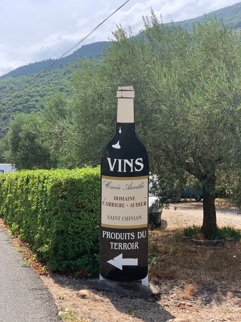 Iâm in biking/hiking heaven, so take off the following day for a big expedition to Gorges DâHeric, apparently âa lovely 9 mile routeâ according to my Cyclemaps App. Now, this App, having led me up the garden (mountain!) path in Germany, has really redeemed itself and found me some great cycle rides in France – but, today it was up to its old tricks and had me pushing the bike along completely inaccessible routes (but they were stunning and off-roadâŚ..hence my love/hate thing with this App). After one particularly hard drop down along an old river bed, I arrived back on the road to find not one but two flat tyres. Where is Tall Bike Guy when I need him??!!!! And, unfortunately I hadnât set this bike up for this eventuality, so I was stuck. I tried sticking my thumb out for a while, but what happened next could only have been written by a comedy geniusâŚâŚa car turned into the lay-by, initially giving me hope, but only for me to find out that he too had suffered from a flat tyre. What were the chances??!! As he was taking up the spot where any good Samaritan could have pulled into (and shouting and swearing in French), I decided to cut my losses and start pushing my bike back to the campsite. Sweltering hot, it was going to be a long 8 miles with no sign of any of the infrequent cars willing to help – I was just going to have to get on with it. Then, coming into hazy view like a mirage in a desert, I caught a glimpse of a red (burgundy?!) sign in the distance. I shook my head and rubbed my eyes thinking I must be hallucinating, but soon, a large wine bottle came into view.
